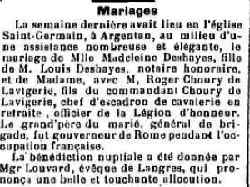 Officier de réserve, Roger CHOURY de LAVIGERIE, fils de Henri et Thérèse de BILLEHEUST d’ARGENTON fut marié à Madeleine née DESHAYES le 10 avril 1923 à Argentan (Orne). Il résidait à Montbray (Manche).