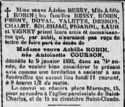 Obsèques : 11 janvier 1892 à Saint-Etienne 42 église paroissiale Saint-Charles ( Source )