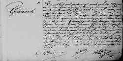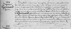 Note familiale : Nous possédons sur parchemin, une copie du contrat de mariage de Jean GUINARD et de Marie FAURE. Ce papier faisait partie des archives de famille. Parmi elles, se trouvait encore un papier, écrit de la main de Jean GUINARD, donnant les dates de naissance, baptême, et les parrains et marraines de ses enfants, avec le lien de parenté.