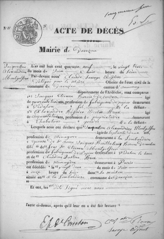 Furent présents Jean-Baptiste MONTGOLFIER, Jean Joseph POLAVER & Joseph THOMAS, LA FAYOLLE, curé. (Source : voir fichier Geneanet d'Yves Dreux).