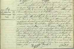 Expédition en papier passée devant Guillaume GOUZIN, notaire toyal, du diocèse du Puy, sénéchaussée de Beaucaire et Nîmes et délivrée sur la minute, trouvée dans un registre en bon état, et à l’instant rendu par de MARAZE, Commissaire Subdélégué, et de CAZENOVE, du contrat de mariage, d’entre Pierre de SAIGNARD, écuyer, coseigneur de Mortesagne, paroisse de Glavenas, diocèse du Puy, Sénéchaussée de Beaucaire et Nîmes, fils de feu Noble Antoine de SAIGNARD et de Demoiselle Yzabeaux de SAINT-LAURENT, ses père et mère d’une part et Demoiselle Suzanne BONNISSOLLE d’autre part.