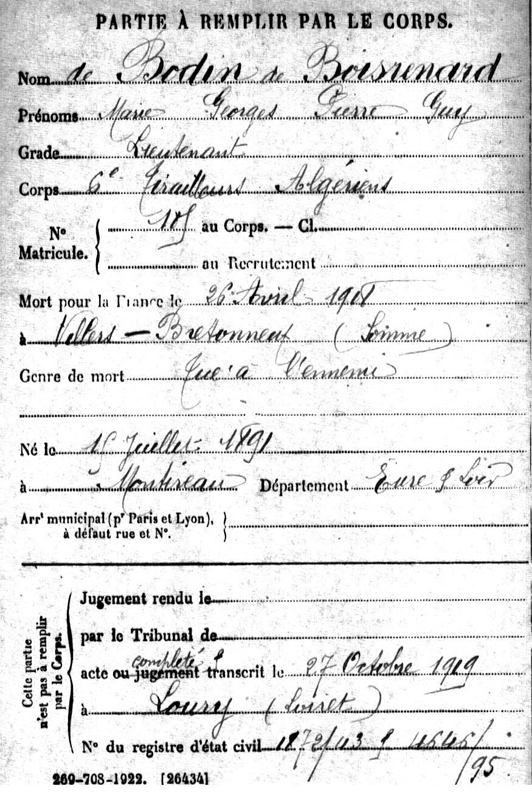 Enfants : BODIN de BOISRENARD (de ) Marie Georges Pierre Guy ( 1891 - 1918 )
