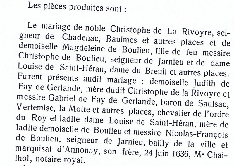 Cote A.D. B 5. Ou 24 juin, ou 26 juin, selon les sources. Furent présent demoiselle Judith de FAY de GERLANDE, mère dudit Christophe de LA RIVOYRE et messire Gabriel de FAY de GERLANDE, baron de Saulsac, Vertemise, la Motte et autres places, chevalier de l'ordre du Roy, dame Louise de SAINT-HÉRAN, mère de ladite demoiselle de BOULIEU et messire Nicolas François de BOULIEU, bailly de la ville et marquisat d'Annonay, son frère.