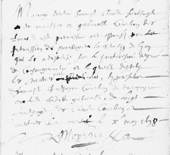 Dispense du 4ème degré de consanguinité. Témoins : Antoine COURBON, de Dargoire, oncle de l'épouse, Louis FONTFREYDE, Claude COURBON.