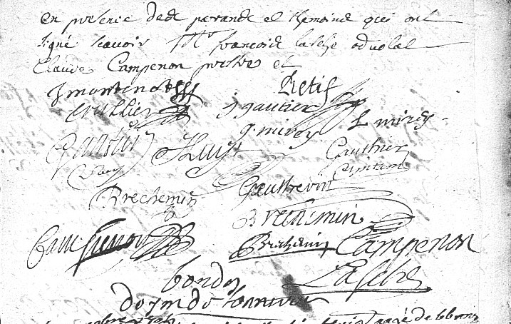 Furent témoins Jean GAUTHIER, frère de l'époux, Claude GIROUX, frère de l'épouse, Philibert DUTRONCY, cousin de l'époux, Philibert LHENRY, son oncle.