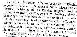 Note familiale : Habitaient le château de La Rivoire, paroisse de Vanosc, au baptême de leur fils Just Antoine (source : Armorial du Vivarais, par Florentin BENOÎT-d'ENTREVAUX, Marseille Reprints, 1979, page 296).