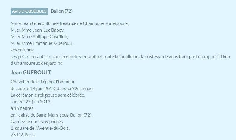 (Source : Insee).Obsèques : 22 juin 2013 à Saint-Mars-sous-Ballon 72290 église paroissiale ( Source )