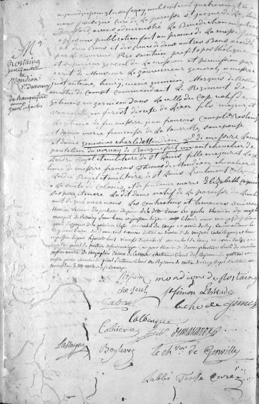 Note individuelle : Veuve de messire Louis Pantaléon DU VERNET de ROCQUEFORT, chevalier de Saint-Louis, native du Limbé, fille de messire François Thomas de MONDION, chevalier de Saint-Louis, lieutenant colonel à la suite des Colonies, commandant du Limbé, et de feue Marie Elisabeth COQUIÈRE.