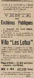 La villa les Lotus fut vendue aux enchères le 23 avril 1910, par maître DUFAURE de CISTRES, notaire à Cannes, pour une mise à prix de 400 000 francs (source : journal le Littoral du 14 avril 1910, page 3).