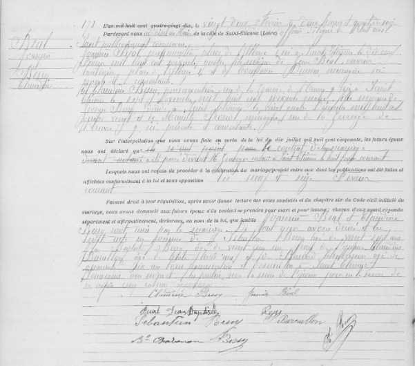 Contrat de mariage : 8 février 1890 à Saint-Etienne 42 reçu maître GRANGER, notaire Mariage : 22 février 1890 à Saint-Etienne 42 ( Source )