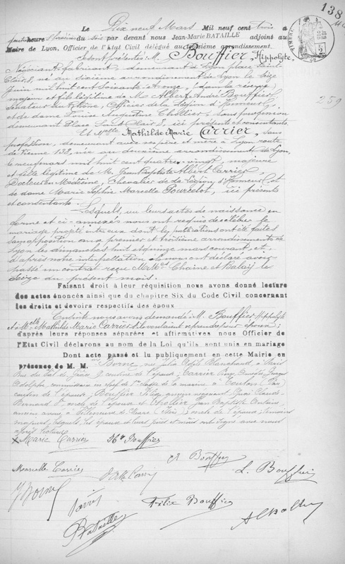 Contrat de mariage : 16 mars 1903 à Lyon 69 reçu Mes CHAINE et BALAŸ Mariage : 19 mars 1903 à Lyon (3ème) 69 ( Source )