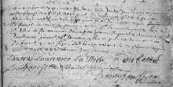 Né le 28, il eut pour parrain sieur Laurens LAURANSON, habitant de Saint-Didier, et pour marraine demoiselle Jeanne de PARCHAS, demeurant à Baubiniers, paroisse de Saint-Sauveur-en-Rue, et pour elle demoiselle Mary du FORNEL, qui signent.